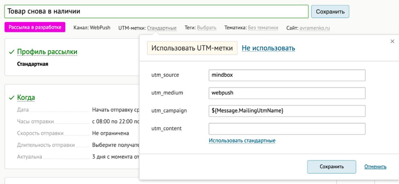 Данные для аналитики вебпушей станут более полными благодаря UTM-меткам. Раньше маркетологи тратили время на ручную разметку ссылок, а теперь стандартные UTM-метки подставляются автоматически. Переходы с вебпушей попадут в аналитику, даже если маркетолог забудет о разметке.